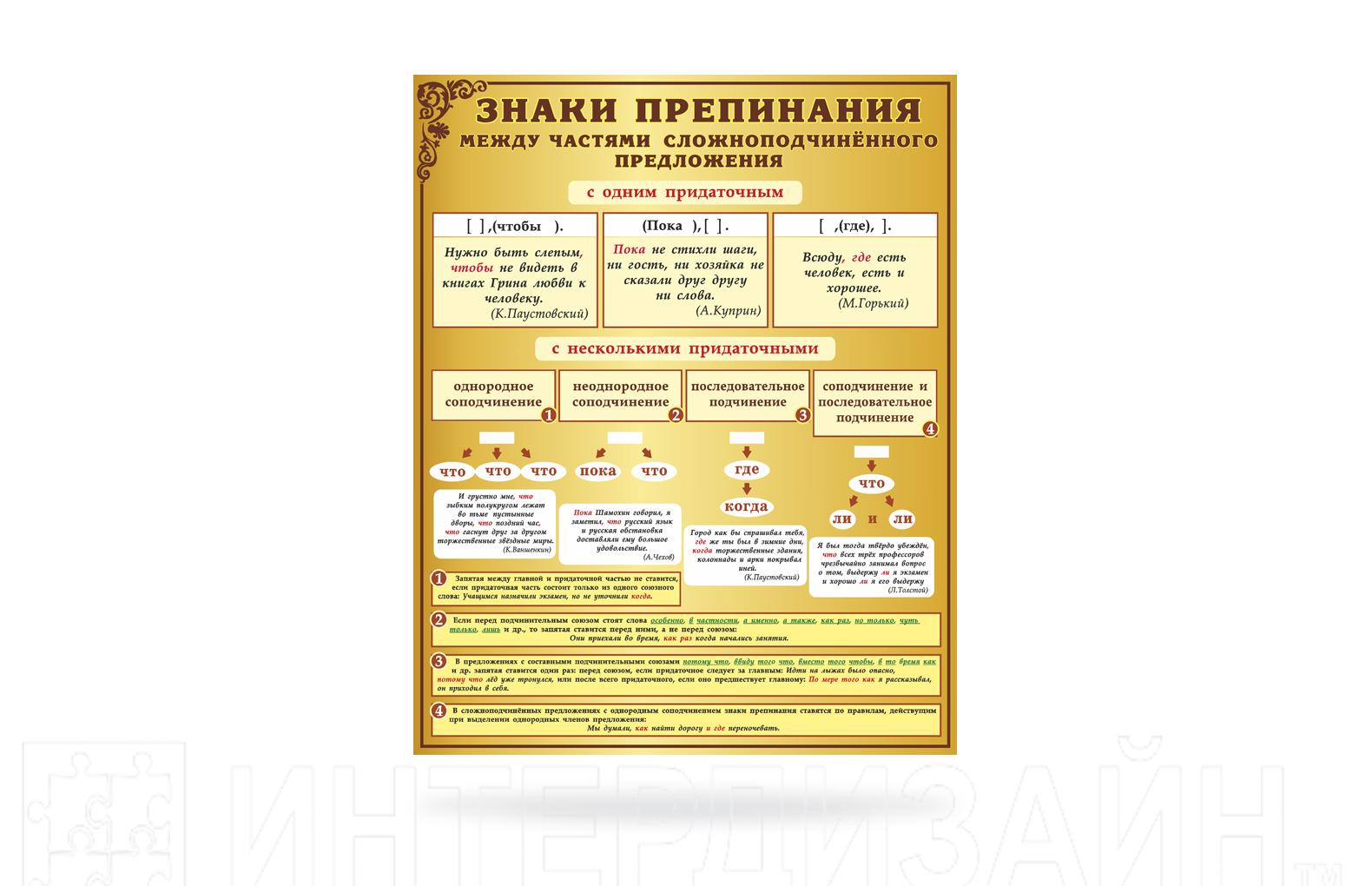 Этот стенд рассказывает о написании знаков препинания между частями сложноподчиненного предложения.