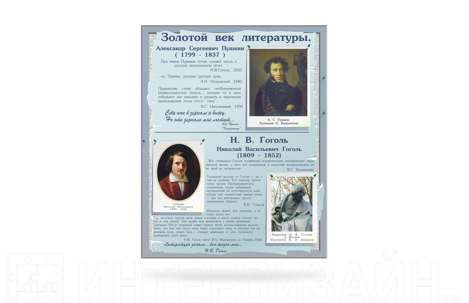 Стенд Золотой век литературы представляет краткую биографию Пушкина и Гоголя. Входит в полный комплект стендов для школы - оформления кабинета русской литературы и русского языка. Можно приобрести отдельно от комплекта.