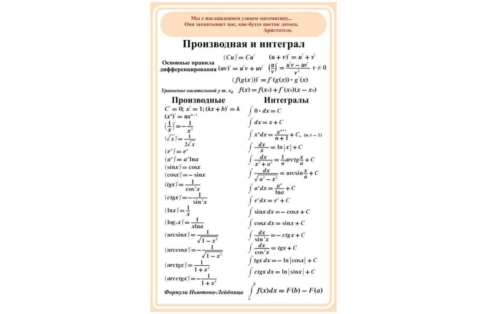 Стенд Производная и интеграл наглядно показывает формулы по которым рассчитываются производные и интегралы. Дополнительная подсказка-напоминание учащимся в кабинете математики. Входит в полный комплект для оформления школьного кабинета, можно приобрести отдельно.