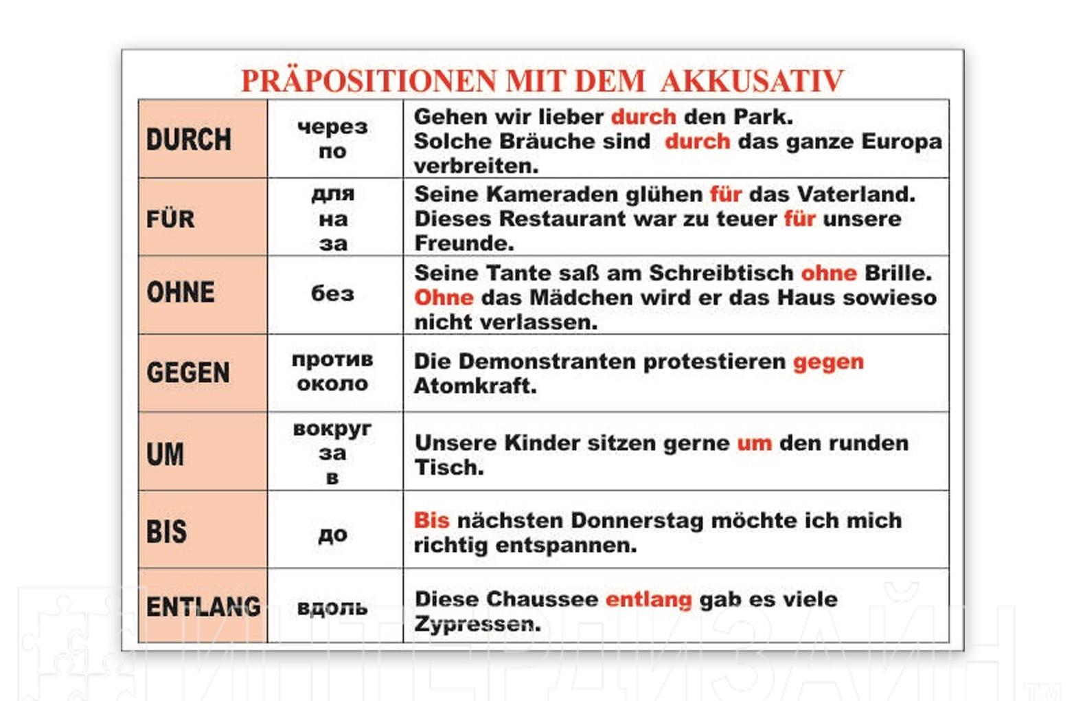 Стенд "Prapositionen mit dem Akkusativ" изготовлен из прочного пластика. Изображение – УФ печать (гарантированно не выгорает, не выцветает на протяжении 5 лет)