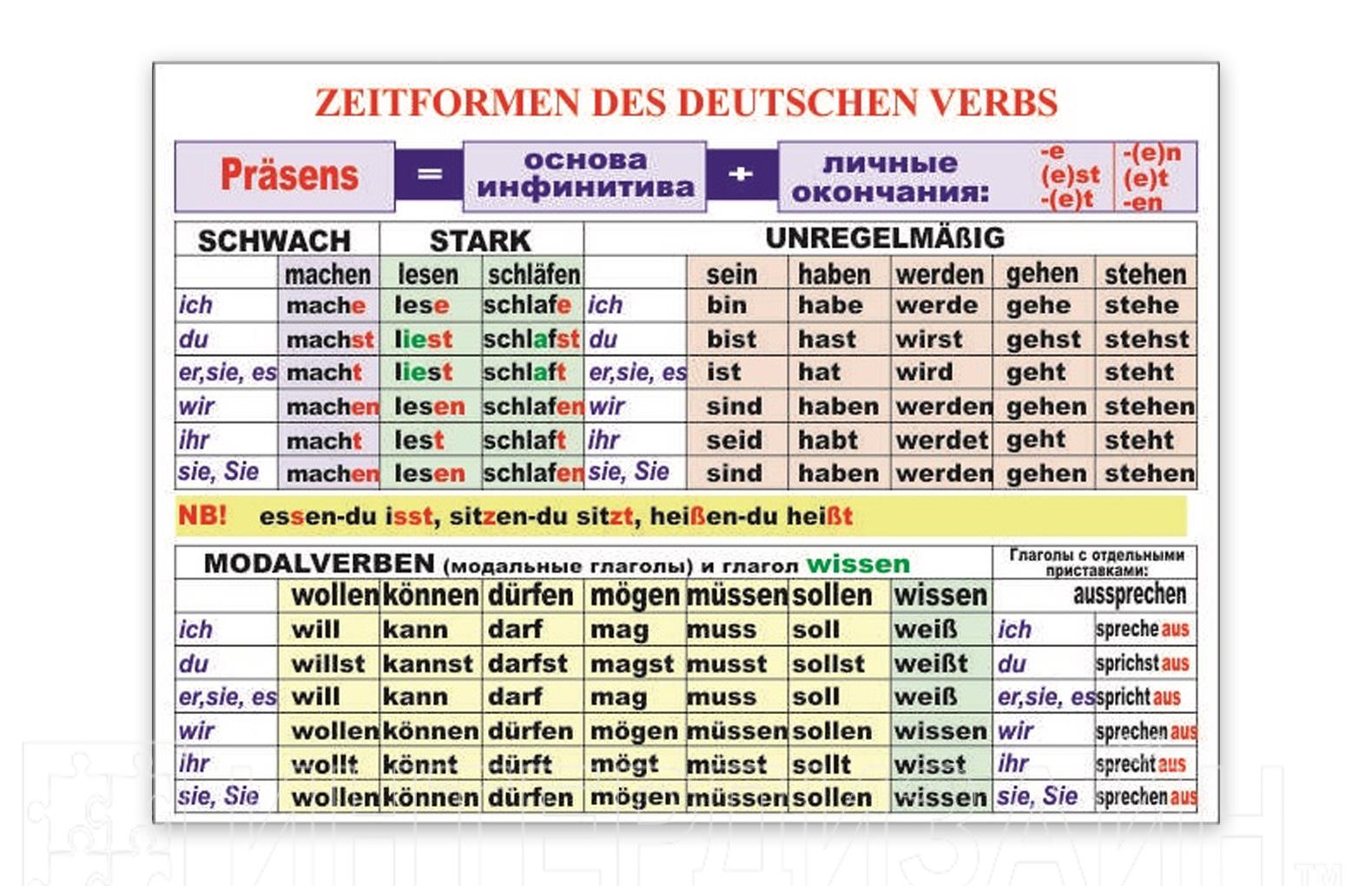 Стенд "Zeitformen des Deutschen verbs" изготовлен из прочного пластика. Изображение – УФ печать (гарантированно не выгорает, не выцветает на протяжении 5 лет)