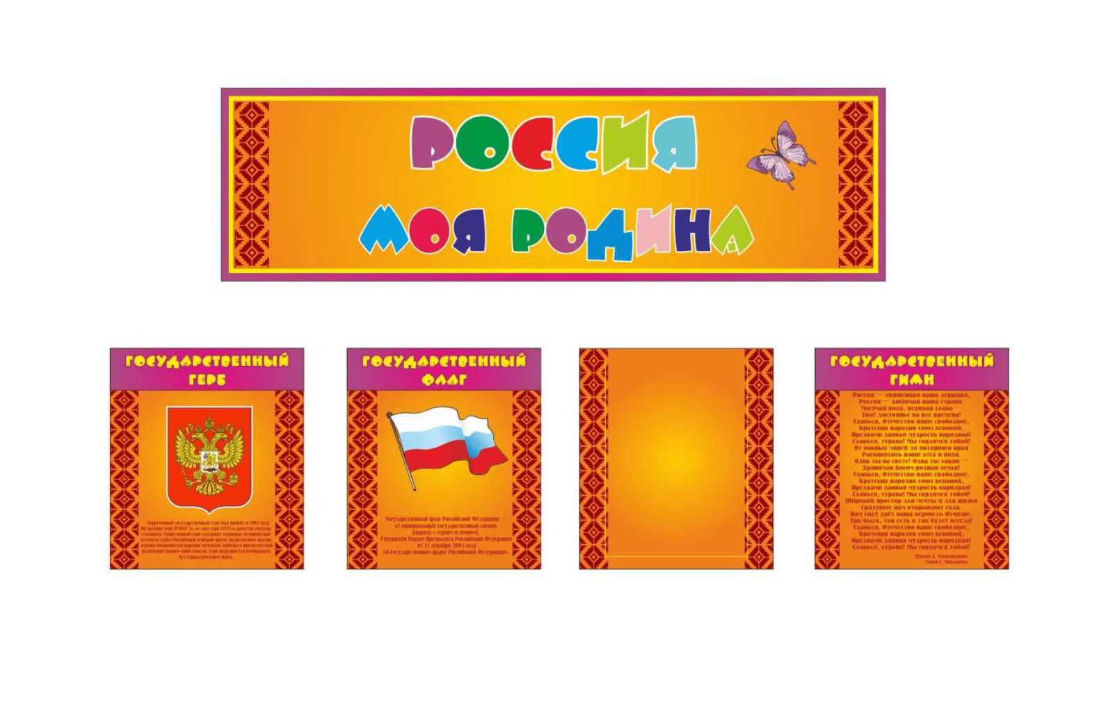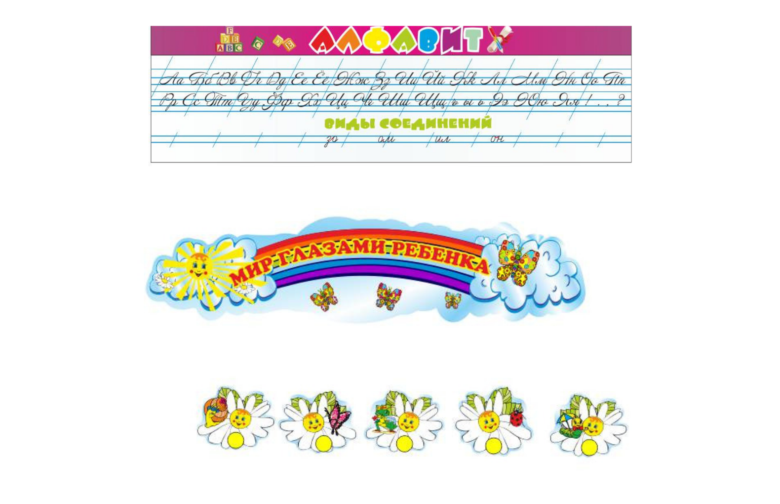 Размершапка "Россия моя родина" - 105х30 см, алфавит 105х30 см, "Мир глазами ребенка" - 68х16 см, крепления для рисунка 12х10 см, жизнь класса - 52х92 см, азбука безопасности - 105х92 см,классный уголок - 105х92 см, стенд полезная информация - 52х92 см