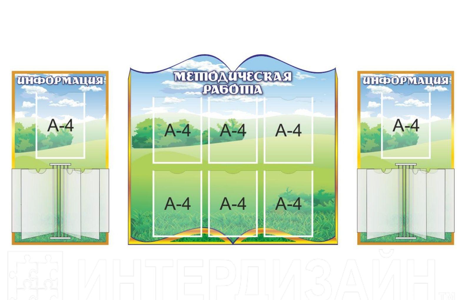 В комплектестенд "Методическая работа" (1100мм*1000мм; 6 карманов А4), 2 стенда "Информация" (455мм*820мм; перекидная система на 5 карманов, карман А4)