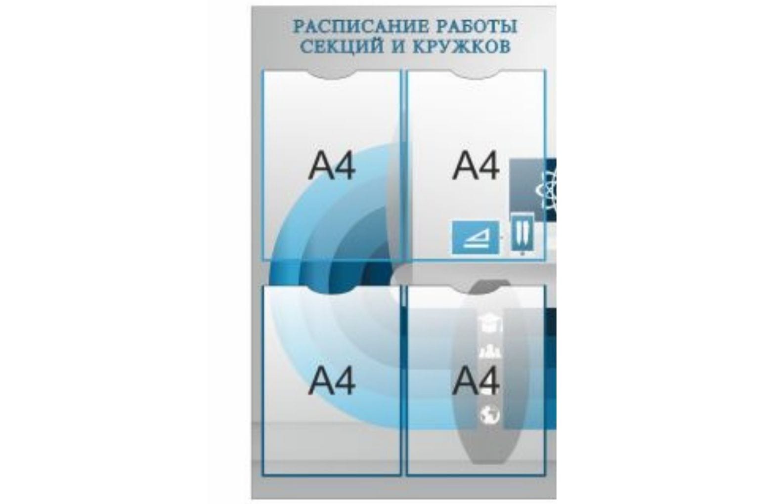 - Стенд: "Расписание работы секций и кружков" (500мм х 800мм). Укомплектован 4 карманами А4 формата.