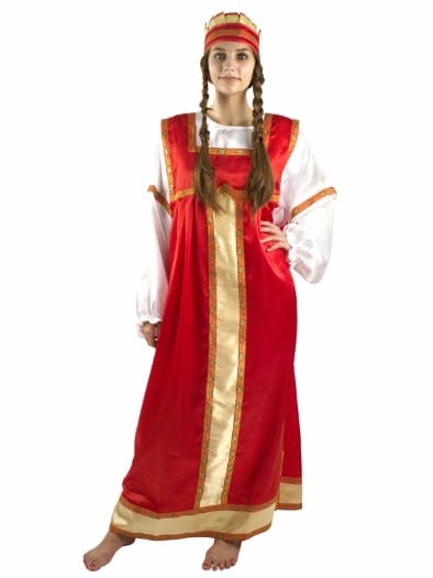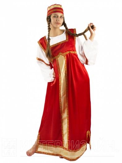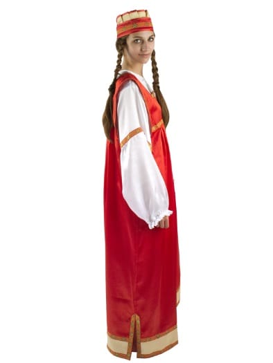Женский карнавальный костюм Аленушка выполнен в традиционных для русского народного костюма цветах - красном и белом. Сарафан отделан жаккардовой лентой. Такая же лента украшает рубашку и кокошник. Русский народный костюм дополняет оригинальный кокошник.