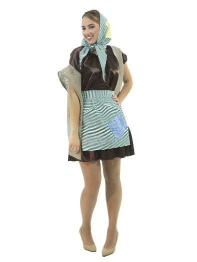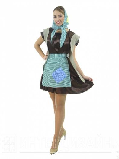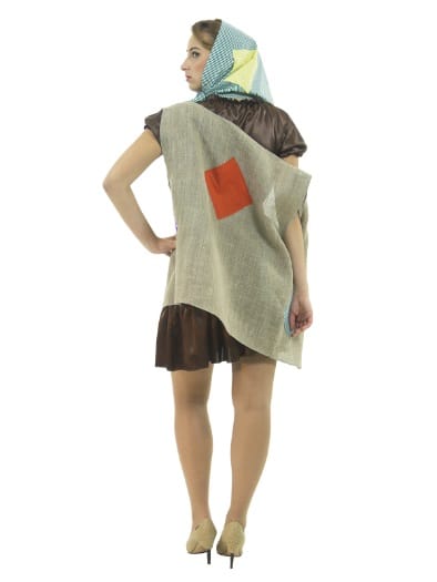 Карнавальный костюм Баба-Яга создан для "модных". В основу костюма легло коричневое платье из крепсатина. Поверх платья надевается удлиненная жилетка с имитацией заплаток, фартук. Дополняет костюм косынка в цвет фартука, которая может надеваться и как бандана.