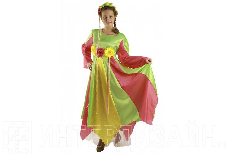 Длинное платье сшито из приятной ткани для сценического образа Лета. Юбка выполнена из клиньев розового, зеленого и желтого цветов, чередующихся между собой. Лиф зеленый, украшен тремя цветочками и лентами в тон.