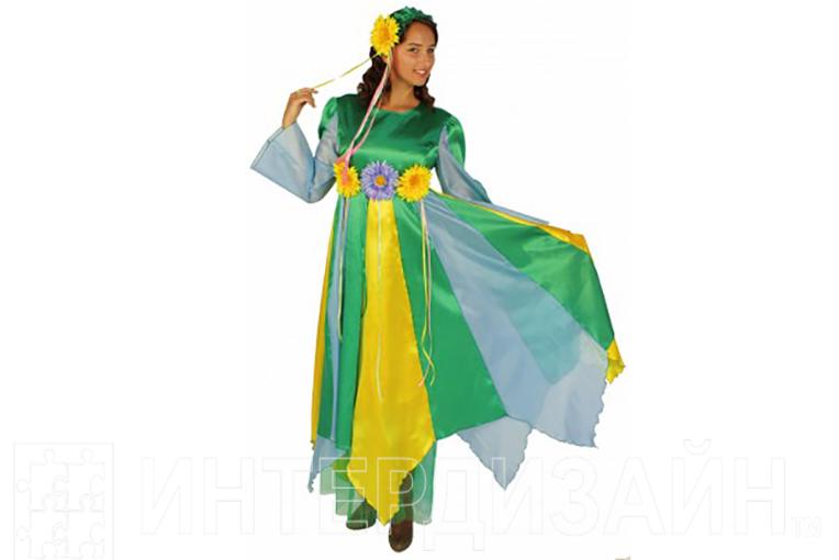 Нарядный комплект, состоящий из платья и головного убора. Наряд выполнен в типичных весенних цветах — голубой, зеленый и желтый. Платье с завышенной талией, длинной в пол, юбка из клиньев вышеперечисленных цветов. Лиф платья со вкусом украшен аппликациями в виде весенних цветов. Рукава длинные, чуть расклешенные к низу.