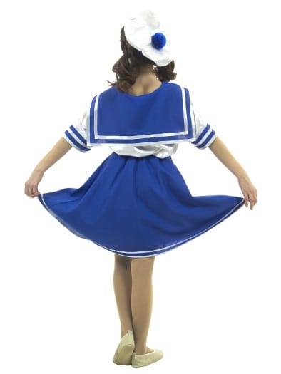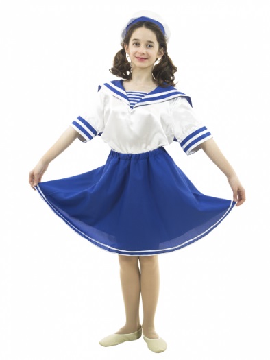 Детский и подростковый карнавальный костюм Морячка - это романтический образ. Расклешенная синяя юбка очень эффектно смотрится на контрасте с белой рубашкой. Наряд идеально подойдет для коллективных выступлений, а также для костюмированных праздников. Рубашка выполнена с имитацией тельняшки и воротника-гюйса.