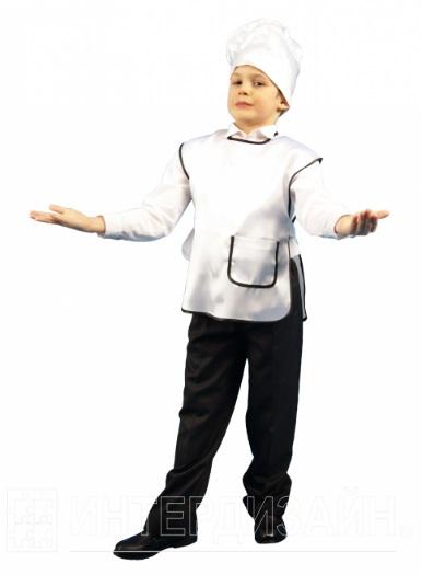 Детский карнавальный костюм Повар состоит из фартука и колпака. Фартук отделан черным кантом и снабжен кармашком.