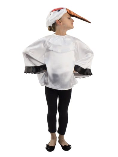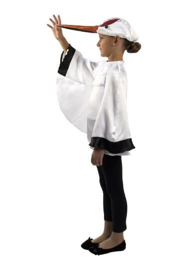 Детский карнавальный костюм Аист подойдет и мальчикам, и девочкам. Костюм стоит из рубашки с рукавами-крылышками и шапочки-маски с длинным клювом. Рекомендуем дополнить костюм черными легенсами и черными туфлями или ботинками.