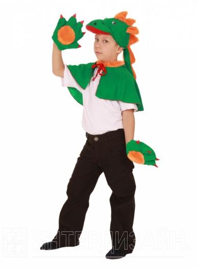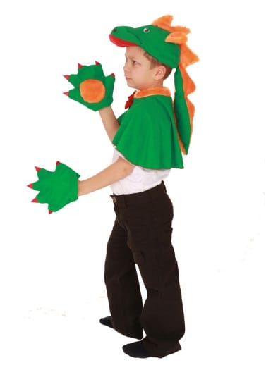 Детский карнавальный костюм Дракон очень любят мальчики. Дракон сильный, смелый, он все может. Именно такими и хотят быть малыши. Именно такую роль помогает им играть наш карнавальный костюм Дракон. Костюм состоит из накидки-пелерины, шапочки-маски и варежек.