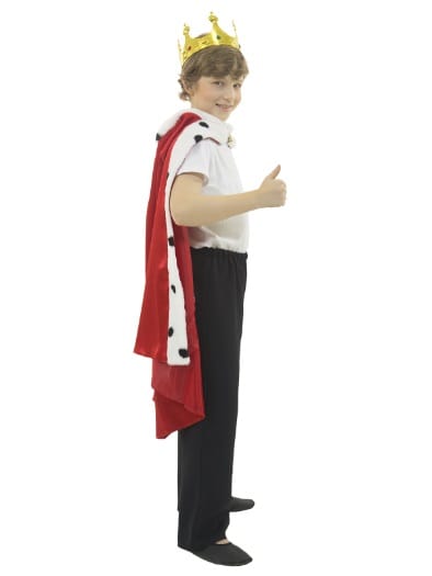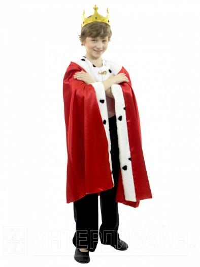 Карнавальный костюм Король - один из самых популярных и любимых детьми костюмов. Он выполнен из красного крепсатина, украшен белым флисом, имитирующим мех. Корона сшита из стрейч-парчи, благодаря чему удобно садится на голову. Плащ-мантия посажен на подкладку. Сверху на горловине мантия фиксируется красивой пуговицей.