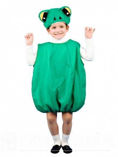 Карнавальный костюм Лягушонок произведен в России. В комплект входит комбинезончик, который широкими липучками фиксируется на плечах, и шапочка-маска с большими глазками.
