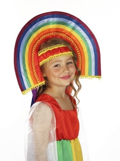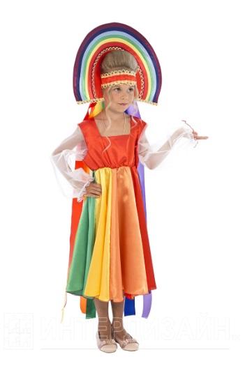 Самое загадочное и самое красивое явление природы - это радуга. Разннобразие цветов, созданное природой, мы отразили в нашем карнавальном костюме «Радуга». «Каждый Охотник Желает Знать, Где Сидит Фазан» - именно эту фазу мы повторяли много раз, когда выбирали и сочетали яркие ткани. В результате мы получили широкое многоцветное платье. Каждый клин юбки соответствует своему цвету радуги. Воздушные рукава из органзы с оборками имитируют пушистые облака, сквозь которые раскинута радуга. Настоящим произведением искусства является кокошник в виде радуги, отделанный золотой тесьмой. Широкие атласные ленты всех цветаов радуги ниспадают до самого пола. Рекомендуем дополнить комплект туфлями в цвет одного из цветов радуги.