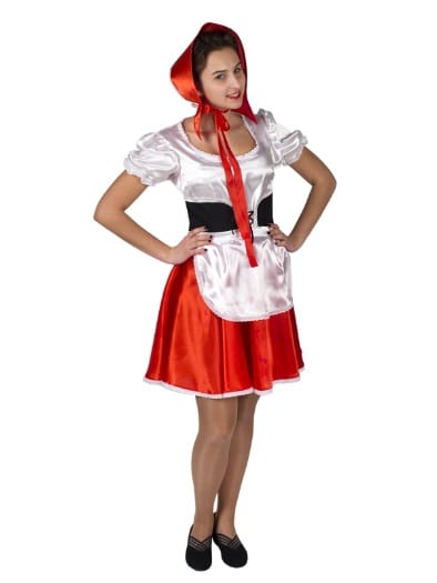 Карнавальный костюм Красная шапочка - самый популярный карнавальный костюм. Костюм состоит из платья и красной шапочки-капора. Жилетка зашнуровывается на груди, шапочка завязывается бантом.