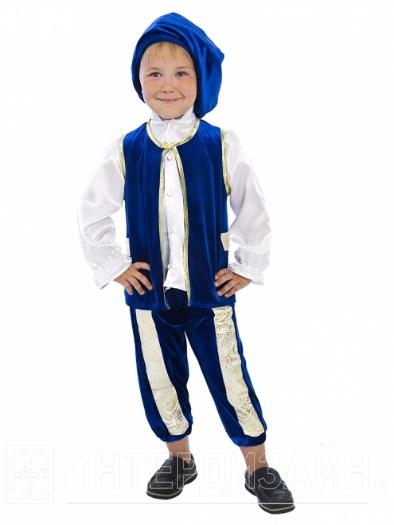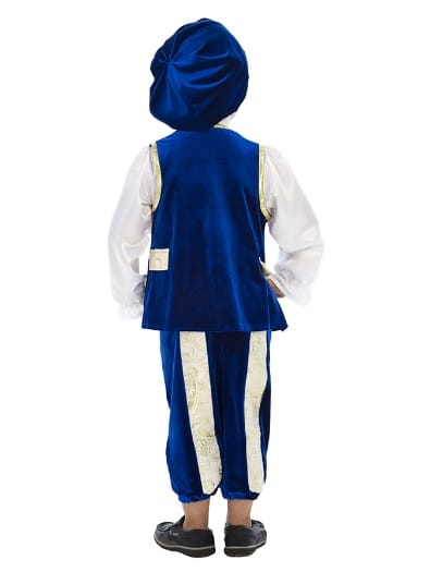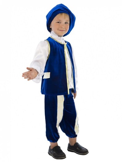 Самый романтичный герой всех времен и народов - принц из сказки Золушка лег в основу карнавального костюма «Принц». Богатое мерцание бархата, роскошный блеск парчи играют и переливаются в каждой складке изделия. Насыщенный и глубокий синий цвет жилета и бридж выгодно контрастирует с лоском белой атласной рубашки с высоким воротом и оборками на рукавах. Жилет фиксируется на шее золотым бантиком. Полочки жилета украшены лацканами из парчи и отделаны золотой каймой. Благодаря вставкам из настоящей злотой парчи бриджи имеют оригинальную геометрию. Длина бридж может регулироваться по желанию резинкой, вставленной по низу изделия. Дополняет комплект широкий бархатный берет. Благодаря тому, что карнвальный костюм «Принц» выполнен из высококачественного стрейч-бархата, его очень комфортно носить. Настоящий костюм, достойный двора Его Королевского Величества! Рекомендуем дополнить комплект белыми носочками или гольфами и синими или белыми ботинками.