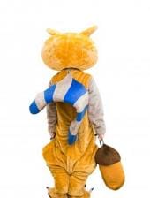 МатериалОбъёмная голова- каркас обшитый плюшем коричневого и серого цветов, смотровая область во рту. Комбинезон из серого и коричневого плюша, на подкладке. Пара перчаток из розового флиса с имитацией черных когтей. Пара обуви из коричневого плюша, с когтями ,на полиуретановой подошве. Орешек-каракс обшитый коричневым флисом.