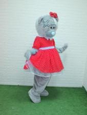 МатериалОбъемная голова сделана из поролона, обшитая плюшем серого цвета, смотровая область в глазах, на подкладке. Накладной живот для объема выполнен из поролона, обшит хлопковой тканью. Комбинезон из плюша серого цвета, на подкладке. Платье выполнено из габардина красного цвета в белый горох, с подъюбником из белого фатина.. Пара варежек из плюша серого цвета. Пара обуви- поролоновый каркас, обшитый плюшем серого цвета, на полиуретановой подошве.