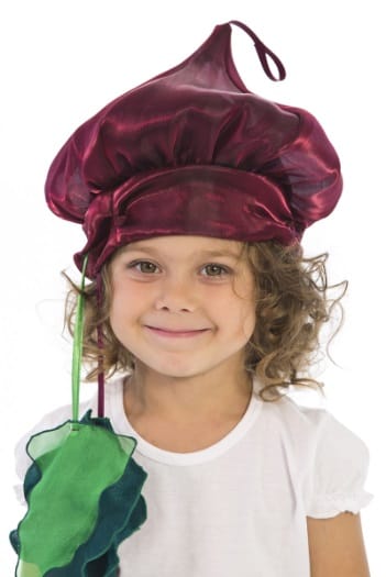 Для приготовления винегрета на празднике Урожая в детском саду не обойдись без свеклы. Именно она становится главным героем и костюм свеклы тоже должен быть подобающим. Карнавальная шапочка «Свекла» выполнена из кресталона, поэтому она красиво переливается и имеет очень интересную и сложную фактуру. Шапочка украшена зелеными листиками из органзы и крепсатина и петелькой, имитирующей длинный свекольный корешок. Для создания объема шапочка подбита синтепоном, а для обеспечения комфортности при носке подбита синтепоном. размер шапочки универсальный, благодаря вставленной резинке. Костюм свеклы подойдет как мальчикам, так и девочкам.