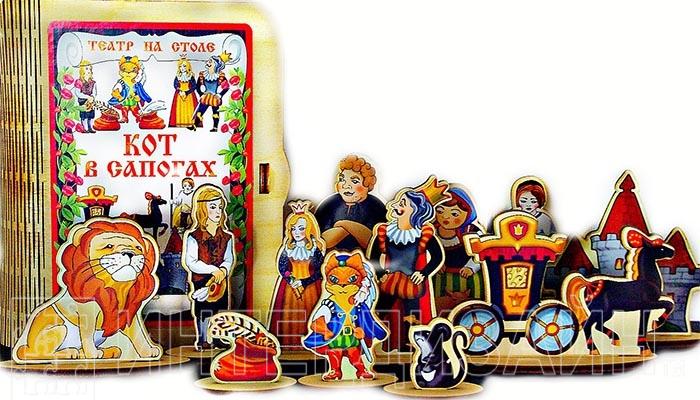 Театр на столе "Кот в сапогах" - набор деревянных фигурок и декораций к спектаклю, удобно упакованный в коробку-книгу. Обязательно понравится любознательным малышам и позволит им провести время с пользой.