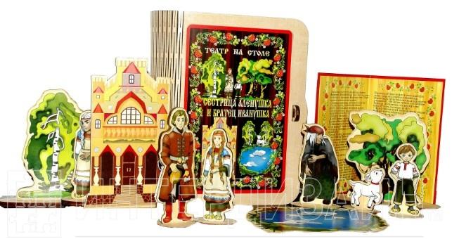Театр на столе "Сестрица Аленушка" – набор для театральной постановки одноименной сказки «Сестрица Аленушка и братец Иванушка» состоит из деревянной коробки, выполненной в форме книги с цветной обложкой, персонажей на подставках, базовых декораций и книга с методическими рекомендациями для облегчения процесса постановки спектакля.