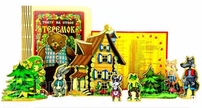 Театр на столе "Теремок" - набор для театральной постановки одноименной сказки «Теремок». Он состоит из деревянной коробки, выполненной в форме книги с цветной обложкой, персонажей на подставках, базовых декораций и книга с методическими рекомендациями для облегчения процесса постановки спектакля.