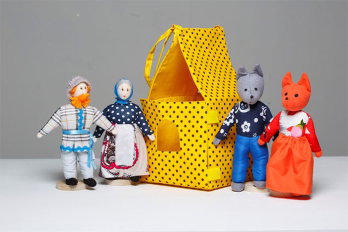 В шагающий театр входят 4 сказочных героев. Все игрушки красочные, сшитые из мягкой ткани разной фактуры. У кукол на ногах есть карманы, в которые ребёнок продевает пальчики и фигурка начинает шагать. Это увлекательное действие вызывает у крохи положительные эмоции.