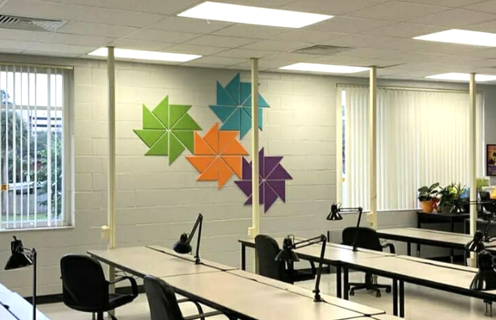 Дизайнерские решения из эко-войлока сделаны из экологичного шумоизоляционного материала. Это очень важно для создания комфортной среды в учебных учреждениях.