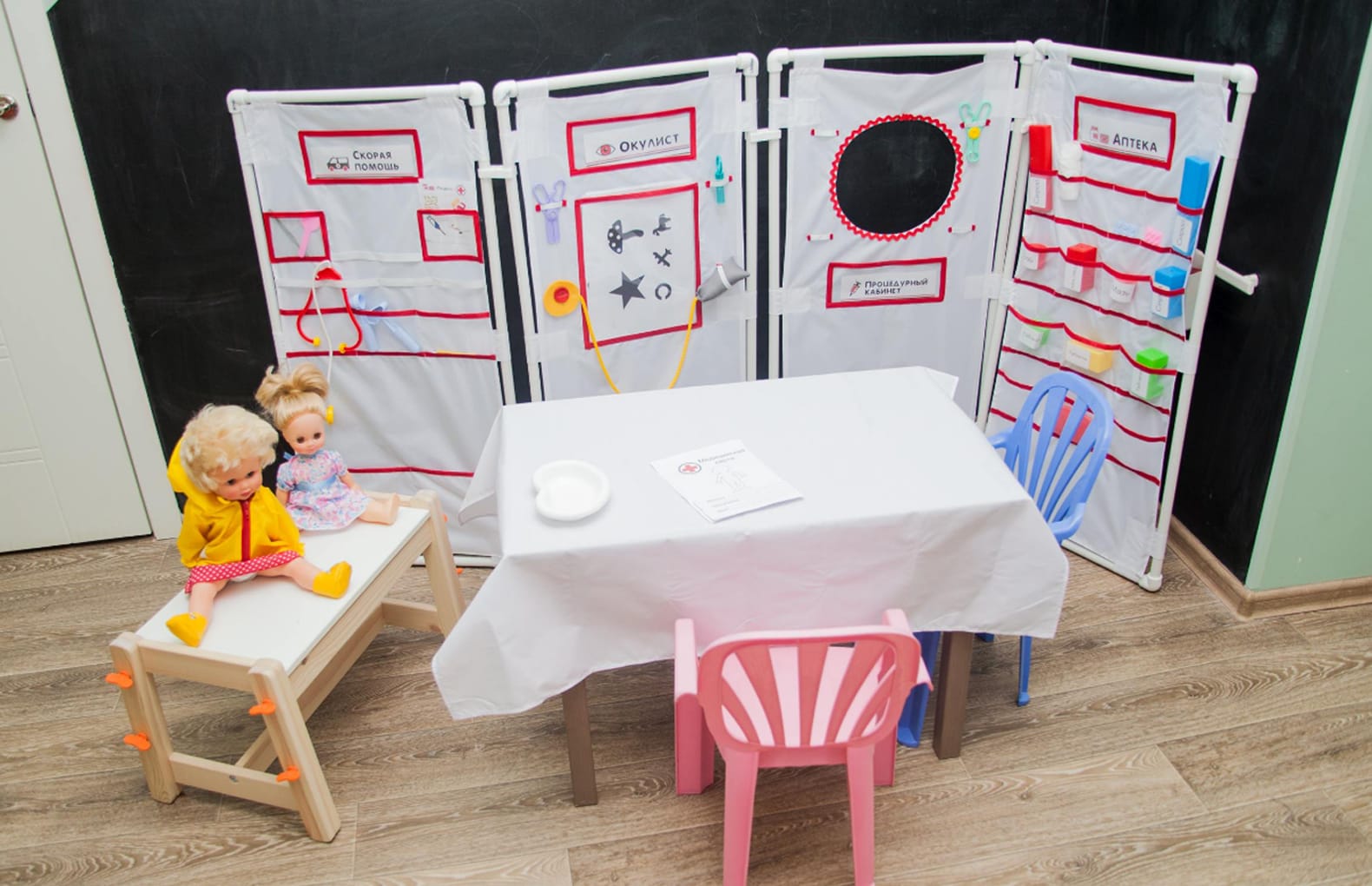 ►Костюмы: Доктор 2 шт, медсестра 2 шт., хирург 1 шт., водитель скорой помощи 1 шт. ►Ширма из труб диаметром 25 мм из 4-х секций. ►Комплект чехлов «Скорая помощь». ►Каркасный автомобиль «Скорая помощь». ►Аксессуары: носилки, белая простынка 77х77 см. ►Бумажная атрибутика: медицинская карта, рецепт, результаты рентгена, результаты УЗИ-диагностики, схема для проверки зрения, надписи к кабинетам, счастливчики (прототип денег) для покупки лекарств, права для водителя скорой помощи.