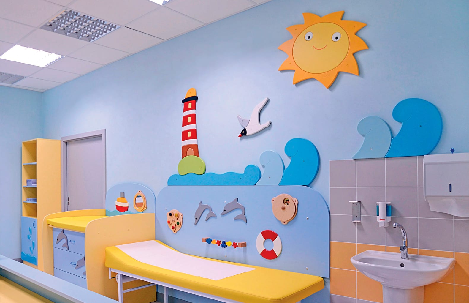 Ориентировочная комплектация: кушетка медицинская детская с декоративными элементами, пеленальный комод с декоративной панелью, шкаф для мед.препаратов с декорацией, комплект настенных оформительских элементов