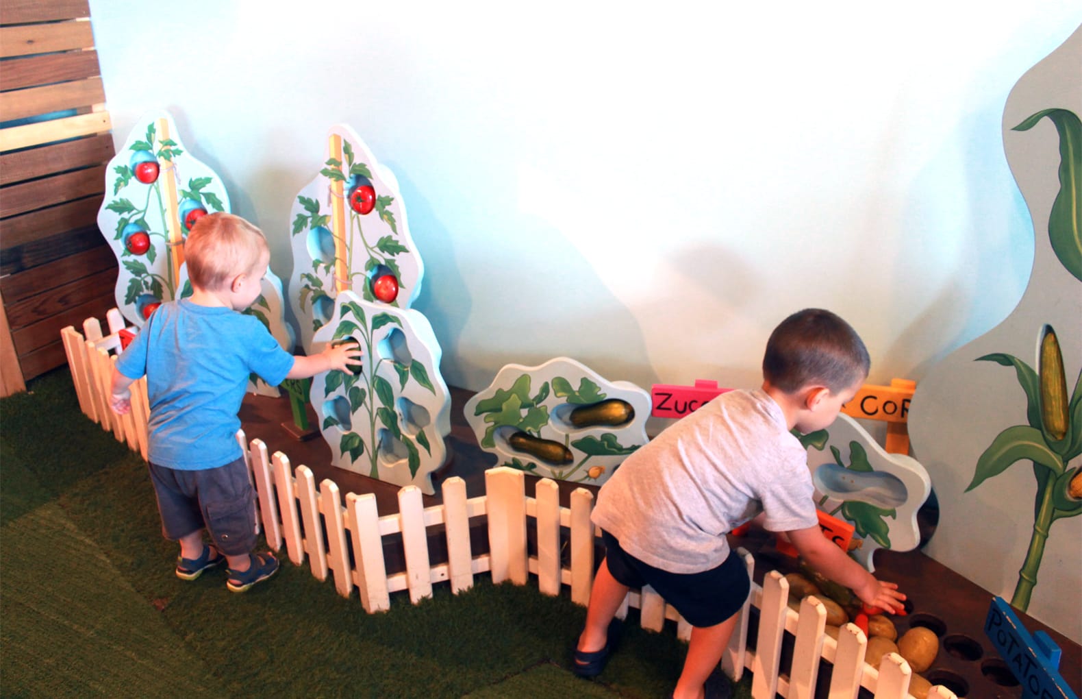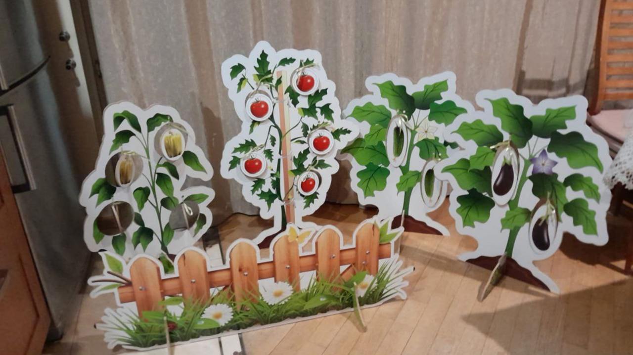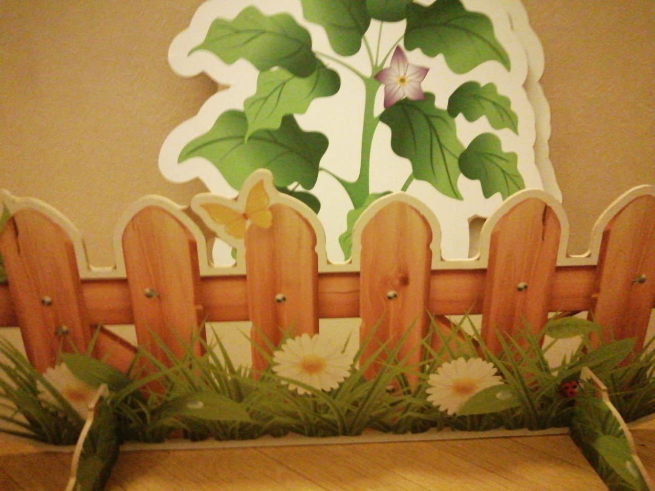 (ограждение – 2 секции, ящик с грядками, комплект декораций Овощи на подставках, комплект муляжей овощей для имитации грядки, фетр коричневый для имитации земли)
