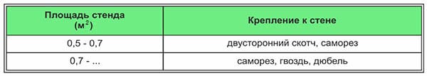 Если же Вам необходимо быстро и без усилий повесить небольшой стенд-используйте двусторонний скотч для монтажа. Каким образом крепить тот или иной стенд наглядно показано в табл. 1.